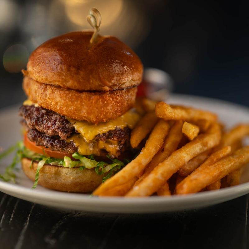 Two smashed beef patties, american cheese crispy onion ring, lettuce, tomato cherry-pepper jam, old bay aioli